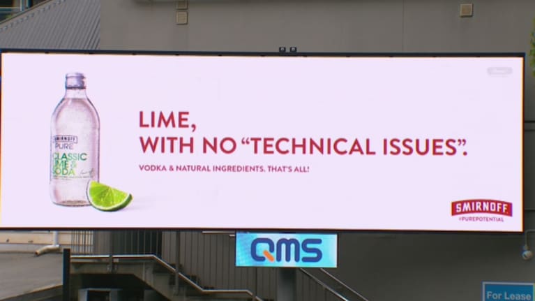 The advertisement promoting Smirnoff's lime-flavoured alcoholic beverage, located on Nelson Street in the Auckland CBD, reads, "Lime with no 'technical issues'".